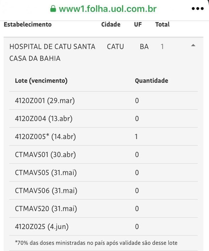 O jornal Folha de São Paulo trouxe em matéria, a informação que dados do Ministério da Saúde mostram que cerca de 26 mil doses da AstraZeneca, fora da validade foram aplicadas em 1.532 municípios. Sesab descarta aplicação de vacina vencida.