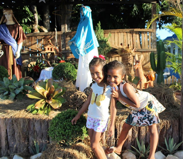 A família Silva trouxe as meninas Ágata Stefane e Laisla Cristine, ambas de cinco anos, para verem o presépio e elas ficaram encantadas e posaram para a lente da nossa câmera em frente ao presépio.