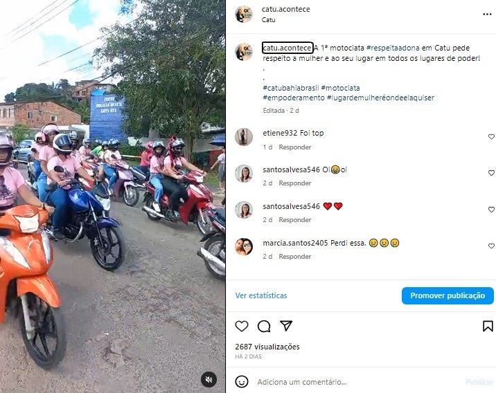 Nos últimos dois meses duas tentativas de feminicídio em Catu chocou a comunidade local. Tamanha violência vem unindo mulheres em ações que visam o bem-estar das mesmas e apoio estrutural, financeiro e pisicossocial, tanto com a rede oficial dos poderes públicos já existente na cidade, tanto com grupos de mulheres como o “Respeita a Dona” , onde cerca de 200 mulheres realizaram nas ruas de Catu uma motociata, pedido respeito ao lugar da mulher tanto no trânsito como também nos espaços públicos e, em todas as esferas da sociedade. Veja registro em vídeo no link a seguir: https://www.instagram.com/p/CwK3iJnsLsU/