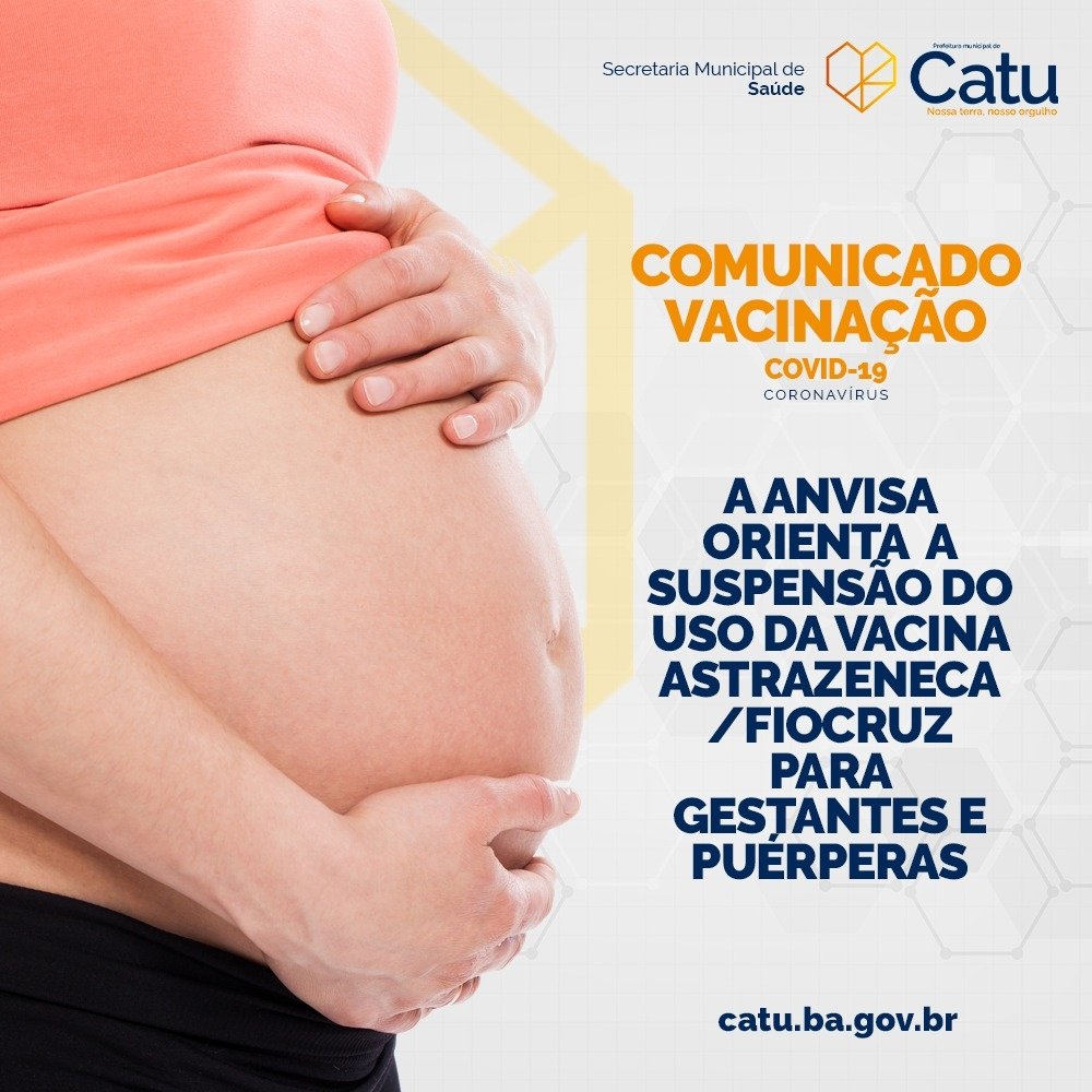 A Secretaria Municipal de Saúde de Catu, em atendimento a orientação da Agência Nacional de Vigilância Sanitária e ao Programa Nacional de Imunizações, interrompeu temporariamente a vacinação de gestantes e puérperas sem comorbidades com as vacinas COVID-19 AstraZeneca/Oxford.