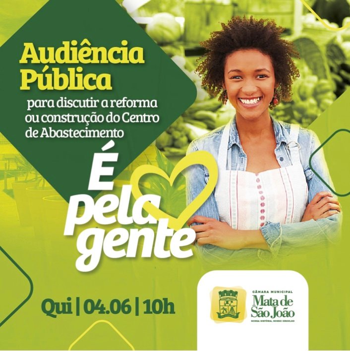 Na próxima quinta-feira, dia 4 de junho, a Câmara Municipal de Mata de São João vai realizar Audiência Pública, a partir das 10h da manhã, para discutir a reforma ou construção do Centro de Abastecimento da cidade.