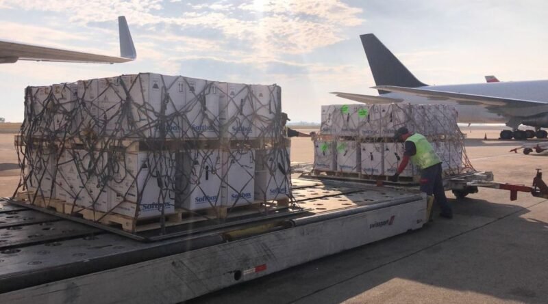 O país recebeu mais 1,5 milhão de doses do imunizante da Pfizer, que chegaram nesta segunda-feira (6) no Aeroporto Internacional de Viracopos, em Campinas (SP).