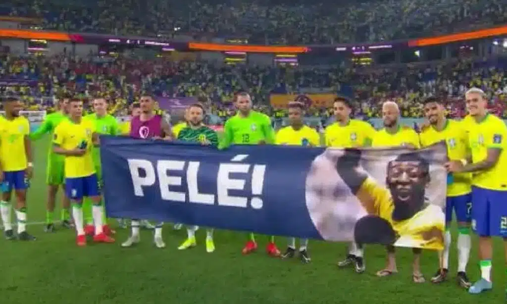 Após a classificação, os jogadores da Seleção Brasileira fizeram uma homenagem ao Rei Pelé. No centro do campo 974, em Doha, no Catar, os atletas exibiram uma faixa com o nome e o rosto do ex-camisa 10.