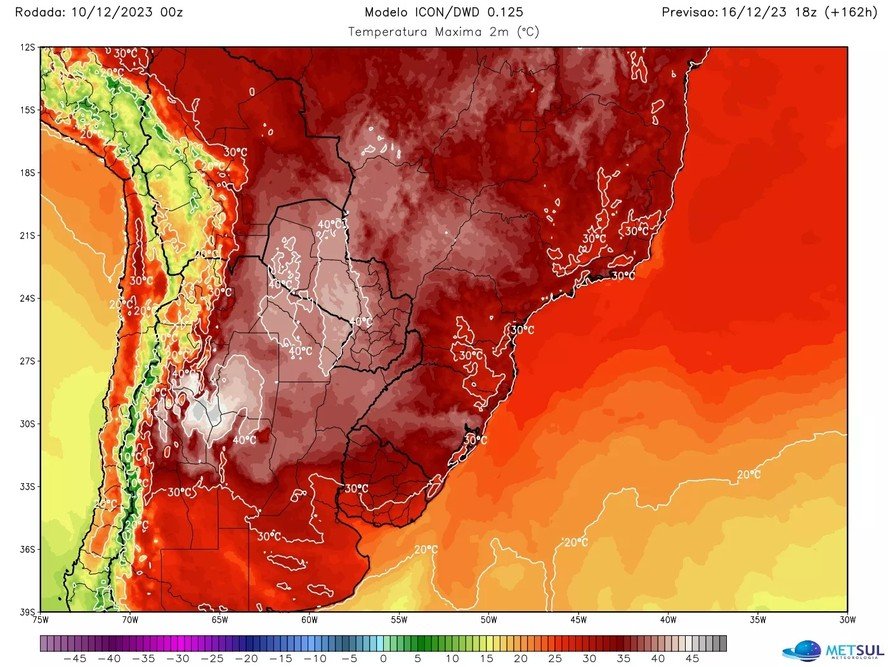 “A MetSul Meteorologia projeta para a metade deste mês o ingresso de ar muito quente nos estados do Centro-Sul do país, o que fará com que a temperatura dispare e alcance valores muito altos, inclusive ao redor dos 40ºC e acima dos 40ºC”, diz o alerta. Isso porque, continua, uma massa de ar muito quente vai se instalar sobre o Norte da Argentina e o Paraguai, expandindo-se para o Centro-Oeste e o Sul do Brasi.