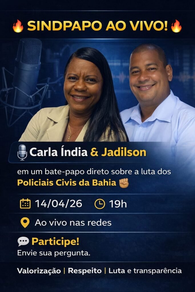 O Sindpapo Podcast promove, nesta segunda-feira (14), às 19h, uma edição especial com a participação de duas importantes lideranças do movimento sindical da Polícia Civil da Bahia: Carla Índia e Jadilson. Os diretores sindicais têm ganhado destaque pela atuação em defesa da categoria e pela construção de novas propostas para a representação dos trabalhadores.