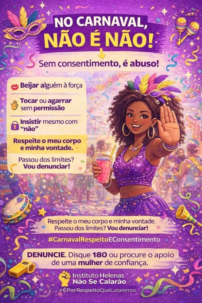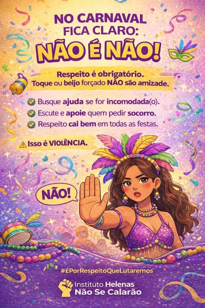 O Instituto Helenas Não Se Calarão (IHNSC) lança oficialmente a Campanha Preventiva de Carnaval 2026, reafirmando que alegria, liberdade e festa nunca podem caminhar junto com violência, abuso ou desrespeito.