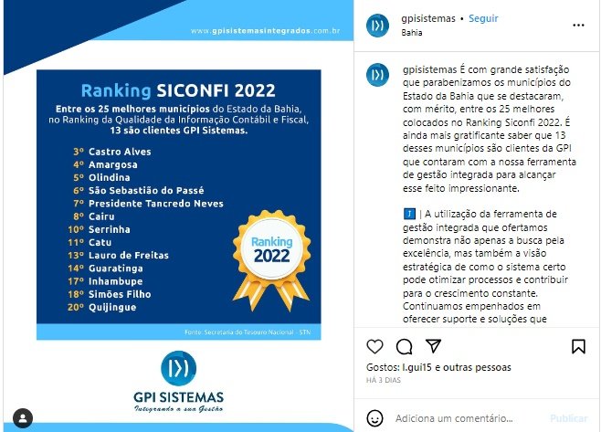 A informação foi divulgada pelo o ranking da qualidade da Informação do Sistema Contábil e Fiscal no Siconfi é uma publicação da Secretaria do Tesouro Nacional – STN – cujo objetivo é avaliar a qualidade da informação e a consistência dos relatórios e demonstrativos contábeis e fiscais que o Tesouro Nacional recebe, por meio do Siconfi – Sistema de Informações Contábeis e Fiscais do Setor Público Brasileiro, de todos os entes federativos, ou seja, da União, dos estados e dos municípios brasileiros. Veja o link a seguir da divulgação oficial das redes do sistema: https://www.instagram.com/p/Cwfg11yAt2Q/?igshid=MzRlODBiNWFlZA%3D%3D