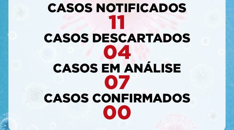 De acordo com o boletim diário da Secretaria de Saúde, através da Vigilância  Epidemiológica, atualizado nesta quarta-feira (1) foram recebidas 11 notificações de casos, 07 estão em análise e 04 foram descartados.