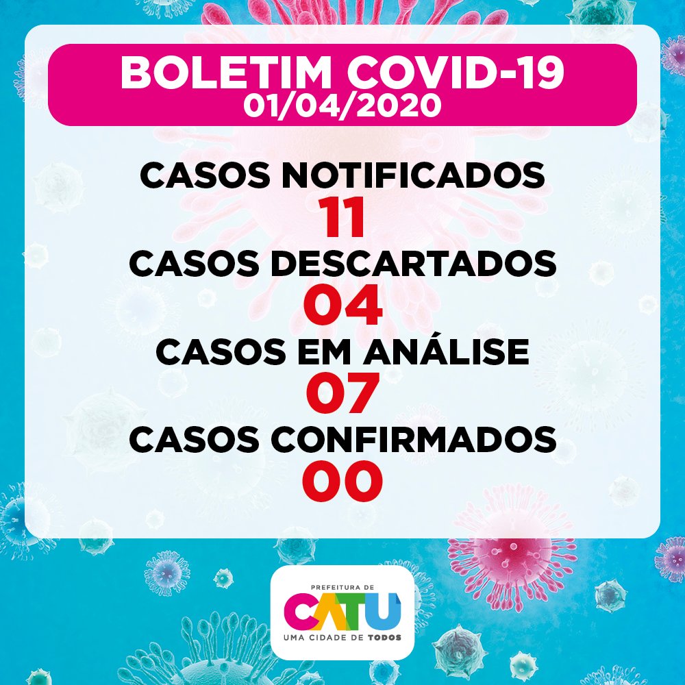 ” Diferente do que foi divulgado no boletim anterior, o município de Catu não possui casos confirmados de Covid-19. Ressaltamos que os números são dinâmicos e, na medida em que as investigações clínicas e epidemiológicas avançam, os casos são reavaliados, sendo passíveis de reenquadramento na sua classificação. Outras informações em saude.ba.gov.br/coronavirus.”