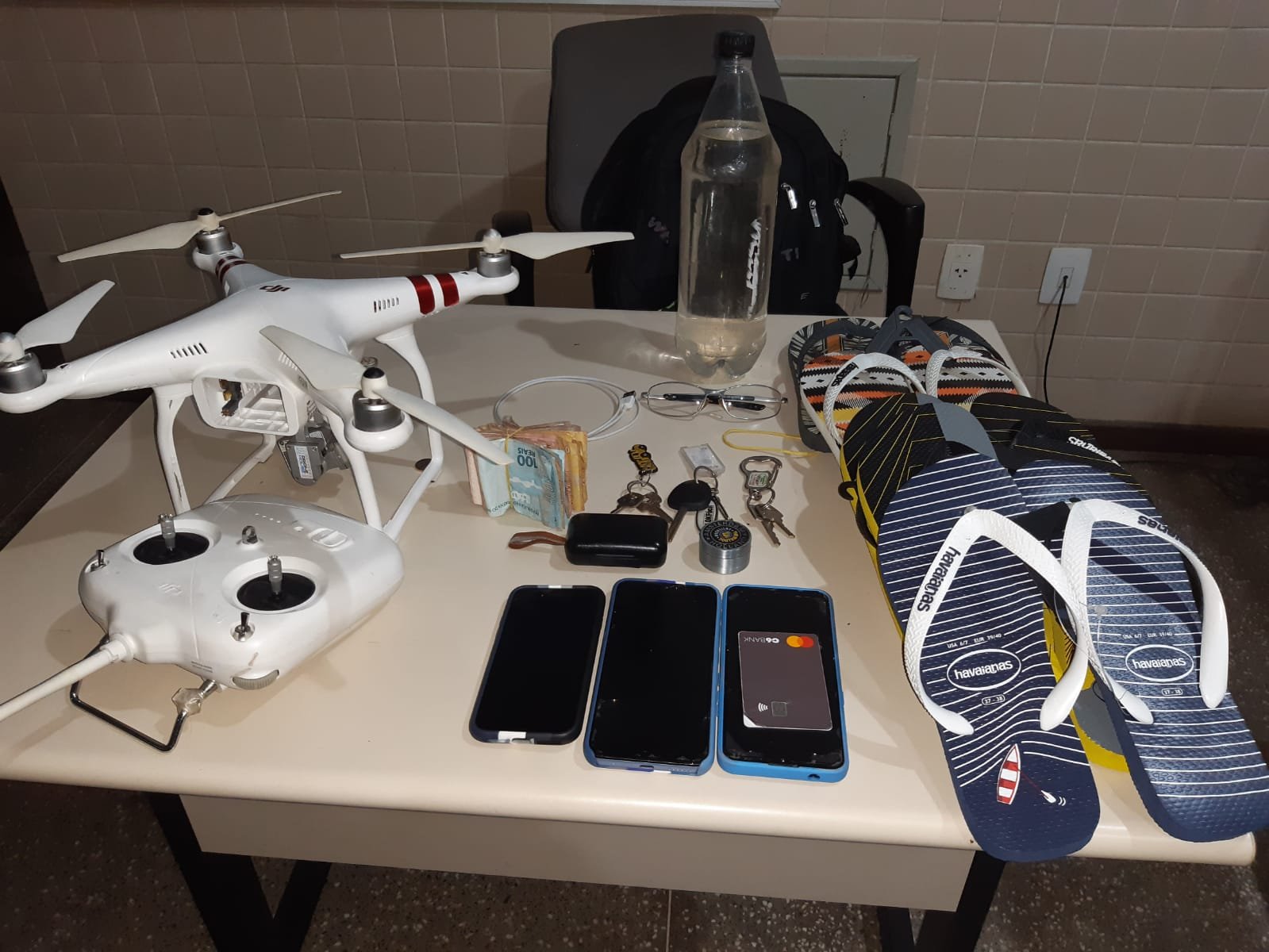 Durante buscas no carro e nos suspeitos, os policiais acabaram encontrando cinco (05) pares de sandálias novas, um drone e uma quantia de R$ 937 com dos indivíduos.