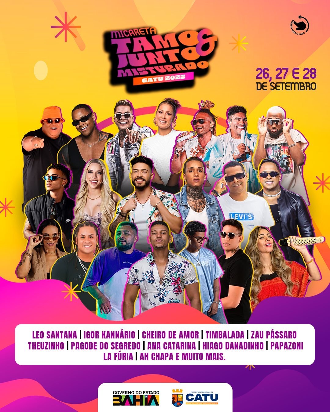 A contagem regressiva já começou e a cidade de Catu ja vive o clima de expectativa da micareta, que acontecerá nos dias 26, 27 e 28 de setembro, trazendo às ruas da Aruanha cores, ritmos e muita energia com a Micareta Tamo Junto & Misturado 2025, que chega com o tema: “Tamo junto de novo” e esse ano vai ser ainda mais misturado.
