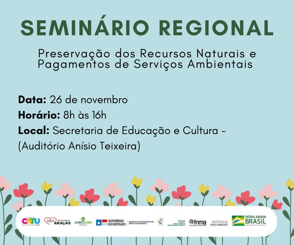 Nesta terça-feira (26), das 8h às 16h, Secretaria de Educação e Cultura (Auditório Anísio Teixeira) – Centro Administrativo, acontecerá o Seminário Regional Preservação dos Recursos Naturais e Pagamentos de Serviços Ambientais. O evento tem o apoio da Prefeitura de Catu, por meio da Secretaria de Infraestrutura e Meio Ambiente.