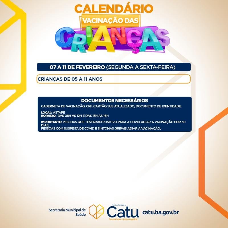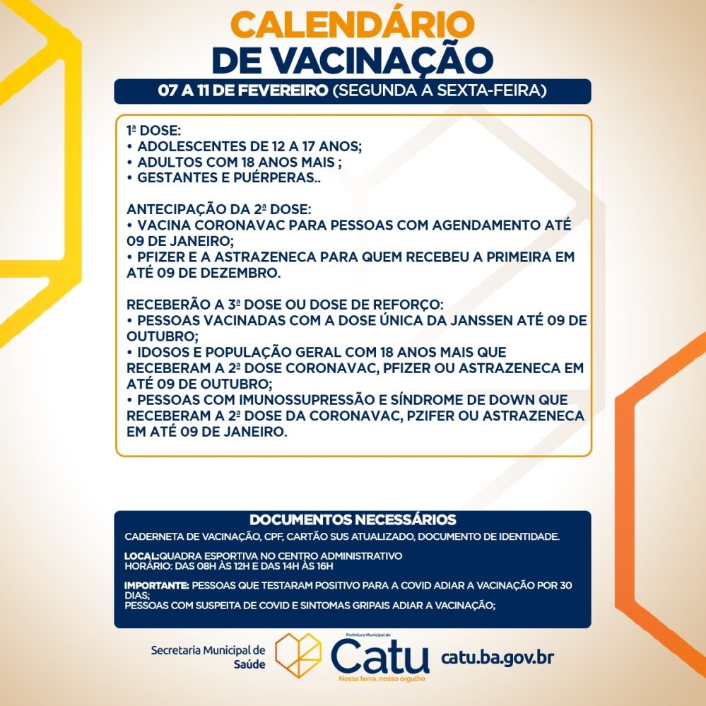 A Secretaria Municipal de Saúde de Catu, divulgou nesta sexta-feira (04), o calendário de vacinação contra a Covid-19 para os próximos dias 07 a 11 de fevereiro, no Centro Administrativo, das 08h às 12h e das 13h às 16h.