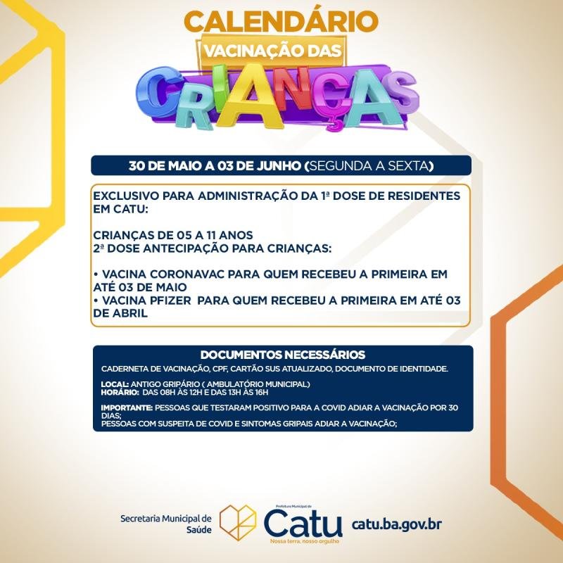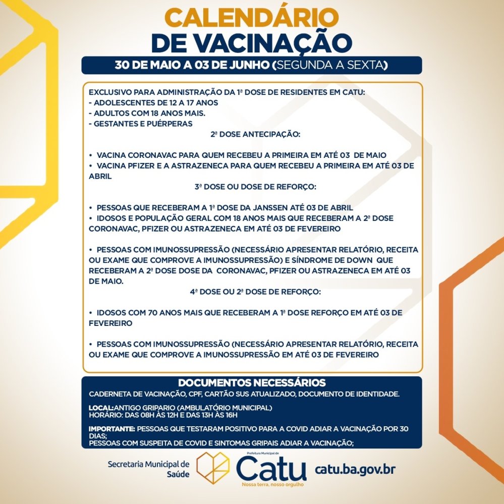 Catu:SESAU anuncia novo calendário de vacinação contra a Covid de 30 de maio a 03 de junho