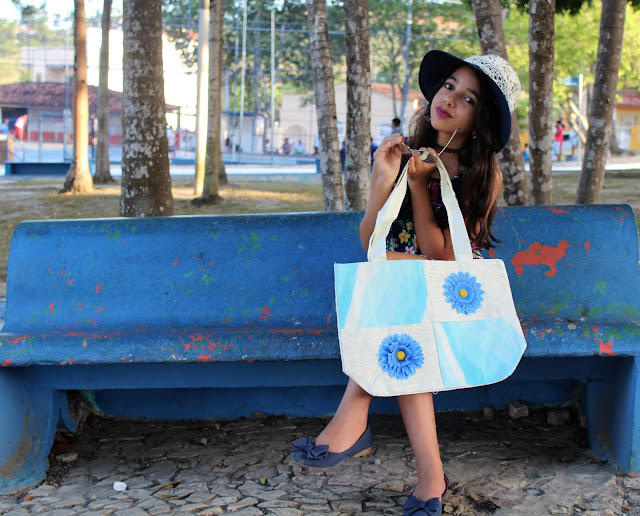 Já essa bolsa, apesar de ter o mesmo estilo da anterior, ganha um clima mais verão chick, com a mudança para uma estampa náutica que combina muito bem com uma tonalidade mais fechada e clássica, tendo uma harmonia perfeita com o chapéu mais escuro. A junção das duas peças dá muito certo.