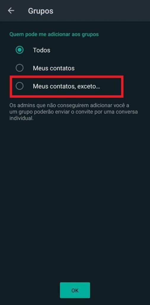 Já a terceira, cria exceções entre seus contatos, sendo possível também estender a restrição para todos, fazendo com que ninguém tenha permissão para te adicionar a grupos no WhatsApp.