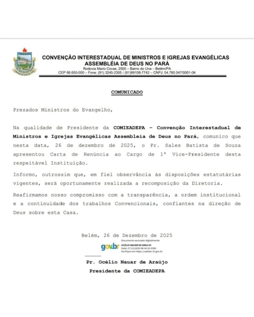 Após a divulgação de vídeos íntimos do então presidente e renúncia oficial, o vice-presidente da Convenção Interestadual de Ministros e Igrejas Evangélicas Assembleia de Deus no Pará (COMIEADEPA) assume o comando em meio a polêmicas e reações nas redes sociais.
