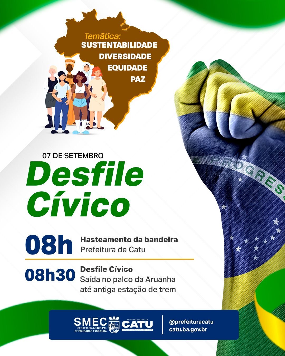No próximo domingo, dia 7 de setembro, Catu celebra a Independência do Brasil com o tradicional Desfile Cívico, que neste ano traz como temática central Sustentabilidade, Diversidade, Equidade e Paz.