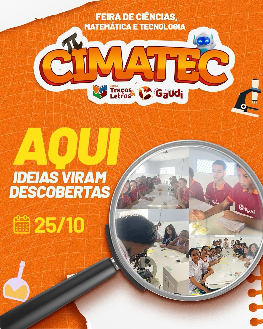 A Escola Traços & Letras e o Colégio Antoni Gaudí realizam, no próximo sábado, 25 de outubro de 2025, das 8h às 12h, a Feira de Ciências, Matemática e Tecnologias (Cimatec), com o tema “Sustentabilidade em Ação: rumo à COP 30”.