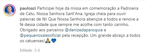 Na missa solene muitos políticos, de Catu de cidades próximas, de paridos de esquerda e de direita, emtre les, o Dep Paulo Az( União Btasil)i, que se fezz prsente à convite de Denize da Paróquia, mas não é o primeiro ano que o político se faz presente na festa em Catu, e registrou o momento nas suas redes sociais. Veja publicação: https://www.instagram.com/p/Cges4rZrCLD/