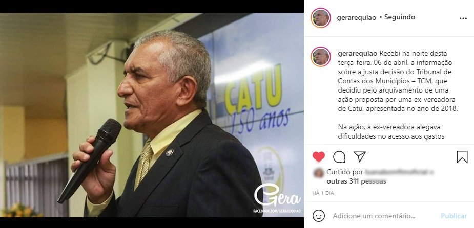 Essa semana as redes sociais catuenses ficaram movimentadas com postagens e discussões na internet, por conta do ex-prefeito Gera Requião(PT), que celebrou o arquivamento de denúncia feita pela vereadora Clara Sena (SD), ao TCM, a despeito das contas de 2019.