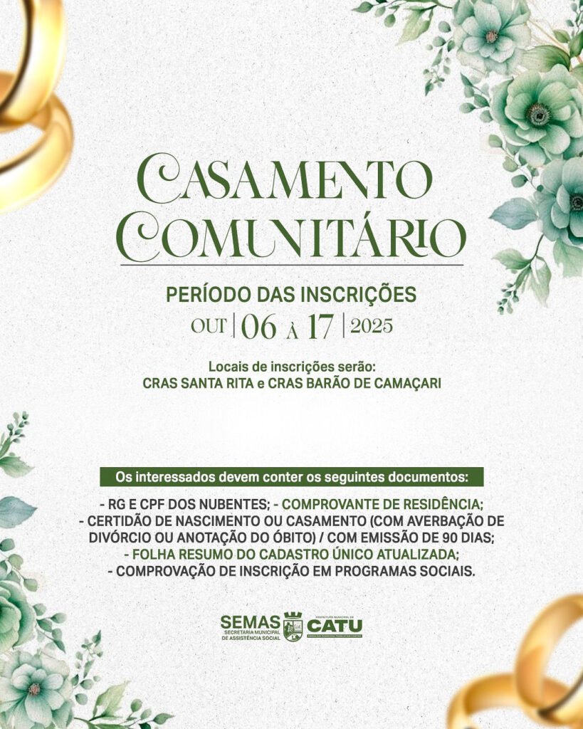 A Prefeitura Municipal de Catu, por meio da Secretaria Municipal de Assistência Social (SEMAS), anunciou a abertura das inscrições para o Casamento Comunitário 2025, que acontecerão entre os dias 06 e 17 de outubro. As inscrições podem ser realizadas nos Centros de Referência de Assistência Social (CRAS Santa Rita e CRAS Barão de Camaçari).
