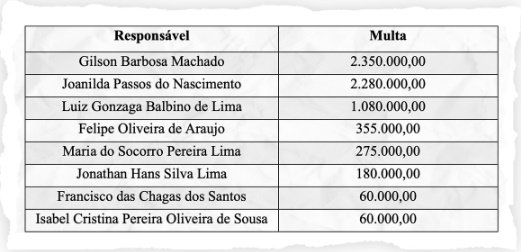 A Corte de contas impôs, ainda, o pagamento de multas individuais aos envolvidos na fraude, a ser realizado no prazo de 15 dias. O valor total ultrapassa R$ 6,6 milhões, calculado conforme a participação de um. Saiba quanto: