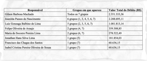 O TCU considerou Gilson Barbosa Machado, punido com a cassação de aposentadoria, como responsável pelas transferências indevidas. Para a Corte de Contas, os outros sete envolvidos – Felipe Oliveira de Araujo, Francisco das Chagas dos Santos, Isabel Cristina Pereira Oliveira de Sousa, Joanilda Passos do Nascimento, Jonathan Hans Silva Lima, Luiz Gonzaga Balbino de Lima e Maria do Socorro Pereira Lima – agiram conjuntamente, por meio de organização criminosa, para fraudar e receber os montantes.