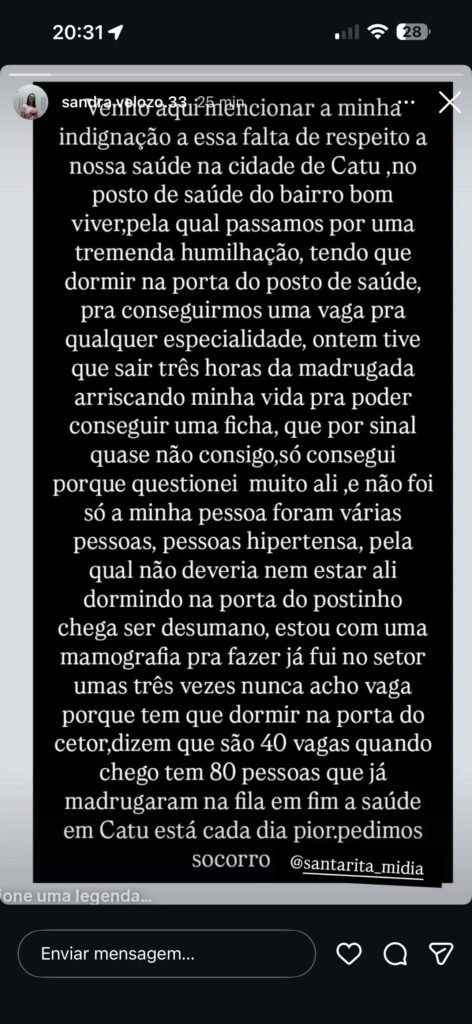 Ainda de acordo com o relato, além do cansaço físico, os usuários se sentem inseguros ao precisarem sair de casa durante a madrugada, colocando a própria vida em risco para tentar acesso a um direito básico garantido pelo Sistema Único de Saúde (SUS).