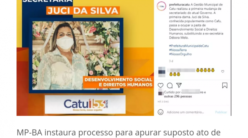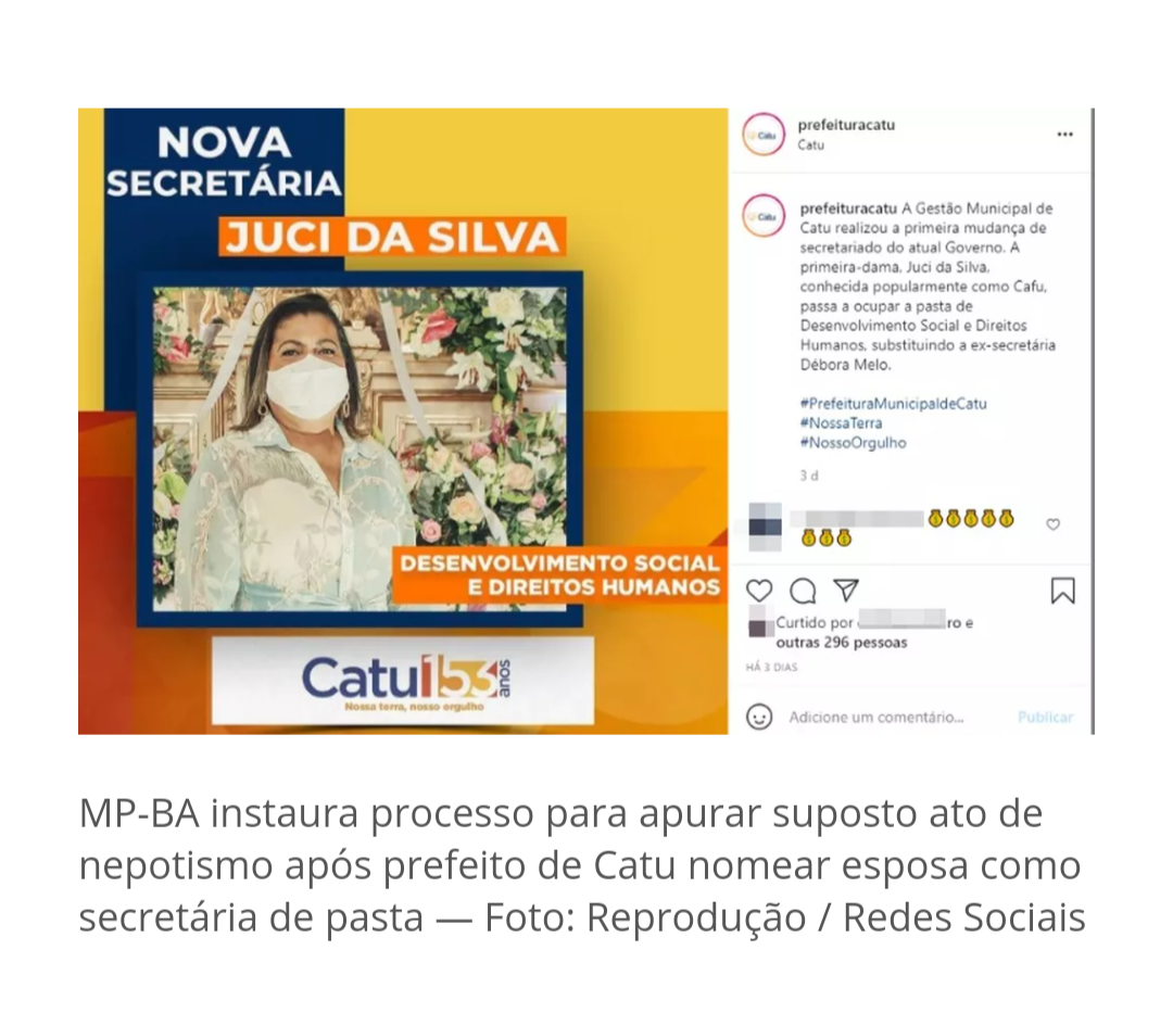 O Ministério Público da Bahia (MP-BA) apura um suposto ato de nepotismo, após o prefeito de Catu, na Região Metropolitana de Salvador, nomear a esposa para ocupar a pasta de Desenvolvimento Social e Direitos Humanos.