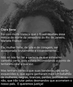 Nas redes sociais, a vereadora Clara Sena manifestou sua indignação com a barbárie e destacou em entrevista o legado de Marielle. “Tentaram calar a voz de uma parlamentar que lutava pelos direitos humanos, pelas mulheres negras e por mais representação feminina na política, e acabaram despertando um movimento contrário. A luta de Marielle por uma sociedade mais justa, agora mais do que nunca é de cada uma de nós, que conhecemos de perto o quão difícil é ocupar mais espaço no cenário político do país. Mas não vamos desistir. Marielle, PRESENTE, SEMPRE”. Pontuou.