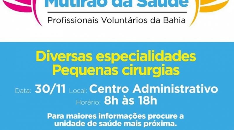 Neste sábado (30), no Centro Administrativo, acontecerá o Mutirão da Saúde, uma série de atendimentos médicos de diversas especialidades e pequenas cirurgias em pacientes previamente agendados das 8h às 18h. O Mutirão faz parte da Primeira Feira de Integração, que acontecerá nos dias 30/11, 01/12 e 03/12, e trará atendimentos jurídicos, psicossociais, serviços de saúde, estética, música, etc.