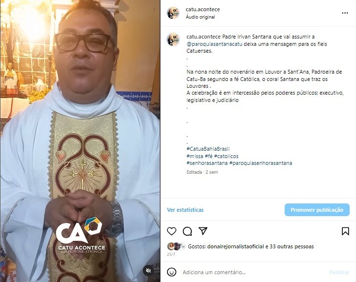 Durante as festividades em louvor a Sant’Ana em julho, o Pe.Irivan celebrou no dia 25/07 a nona noite do Novenário em louvor a Padroeira e aproveitou e deixou uma mensagem para os catuenses, se comprometendo com a comunidade e ressaltando o compromisso de implantar na cidade um seminário para formação de futuros vocacionados ao ofício de ministro do evangelho dentro da igreja católica. Veja mensagem no link a seguir: https://www.instagram.com/p/CvI7VDHsrBz/