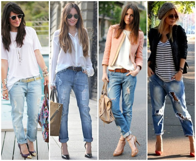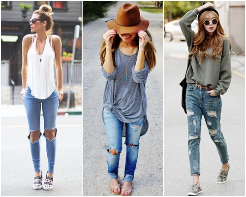 A calça jeans rasgada, ela fica linda com uma blusinha branca com um cinto, pois o ele ajuda muito a deixar a roupa mais arrumada. Blusa listrada também com um blazer como na foto abaixo , fica muito bem e mostra atitude.