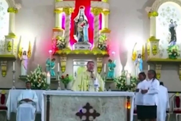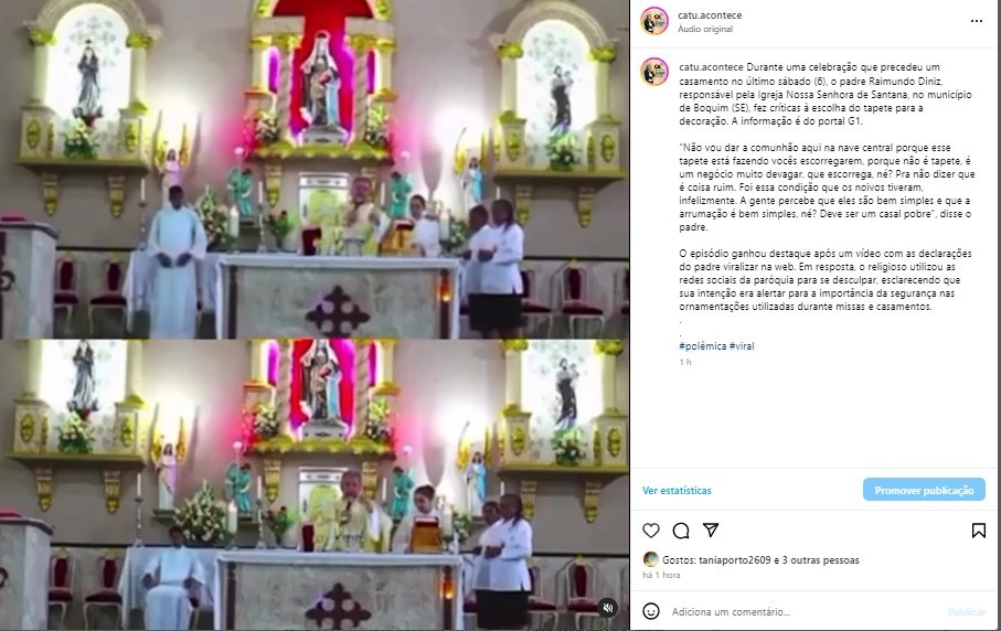 “Não vou dar a comunhão aqui na nave central porque esse tapete está fazendo vocês escorregarem, porque não é tapete, é um negócio muito devagar, que escorrega, né? Para não dizer que é coisa ruim. Foi essa condição que os noivos tiveram, infelizmente. A gente percebe que eles são bem simples e que a arrumação é bem simples, né? Deve ser um casal pobre”, disse o padre no meio da missa.