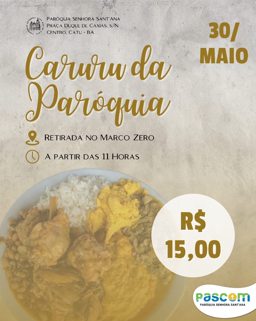 As encomendas para o caruru os interessados devem procurar a Secretaria Paroquial (pelo instagram ou telefone 3641-1014) e reservar o seu caruru. Lembrando que o bilhete é individual no valor de R$15,00. No domingo, a partir das 11 horas, deve-se apresentar o bilhete para retirada no Marco Zero.