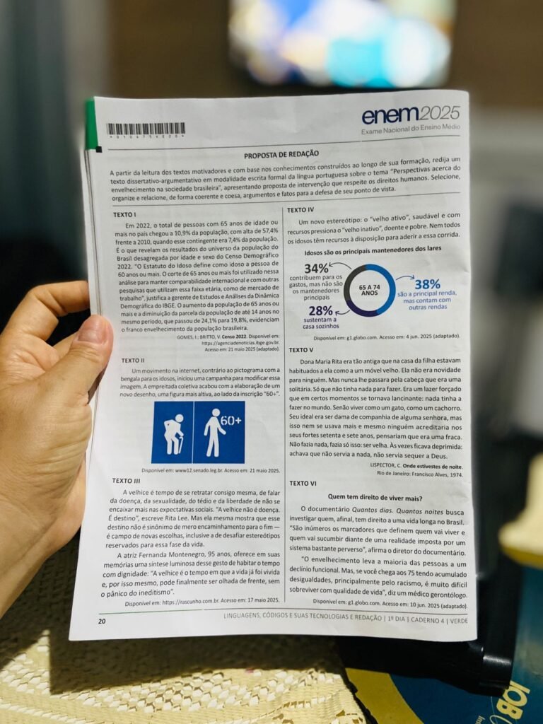 O tema da redação do ENEM 2025, anunciado como “Perspectivas acerca do envelhecimento na sociedade brasileira”, abre espaço para que milhões de estudantes reflitam sobre as transformações demográficas, os desafios e as oportunidades que a crescente longevidade impõe à sociedade.