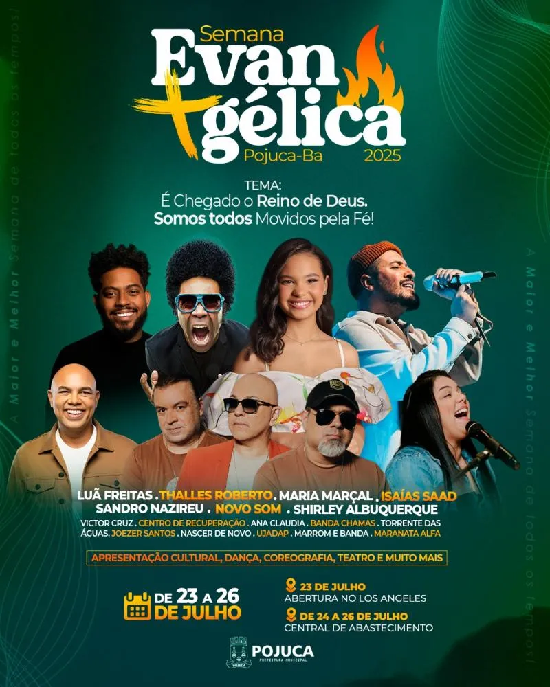 Entre os dias 23 e 26 de julho, será realizada a edição 2025 da Semana Evangélica, com o tema “É Chegado o Reino de Deus. Somos todos movidos pela fé!”. O evento, promovido pela Prefeitura de Pojuca, promete quatro dias de intensa programação espiritual, cultural e artística, com entrada gratuita.