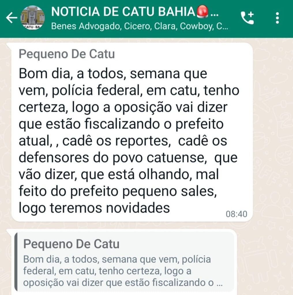 “Bom dia, a todos, semana que vem, policia federal, em catu, tenho certeza, logo a oposição vai dizer que estão fiscalizando o prefeito atual, cadê os “reportes”, cadê os defensores do povo catuense, que vão dizer, que está olhando, mal feito do prefeito pequeno sales, logo teremos novidades.” Escreveu.