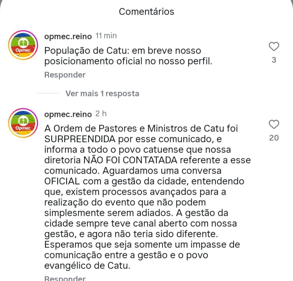 Após a divulgação da nota, a Ordem dos Pastores e Ministros do Evangelho de Catu (OPMEC) publicou um breve comunicado em seu perfil oficial nas redes sociais, informando que deverá se posicionar oficialmente sobre o ocorrido ainda nesta sexta-feira.
