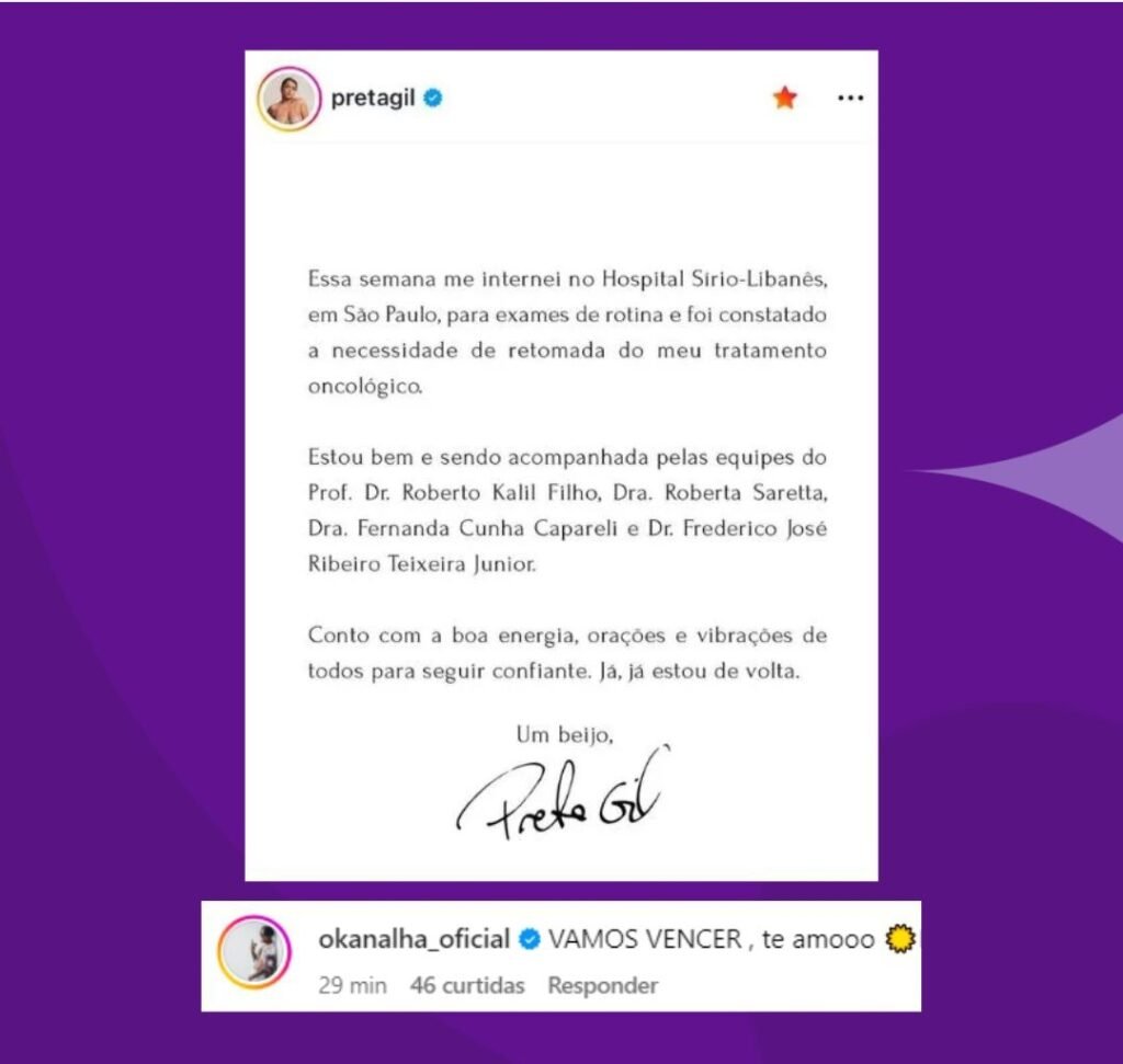 “Esta semana me internei no Hospital Sírio-Libanês em São Paulo, para exames de rotina e foi constatado a necessidade de retomada do meu tratamento oncológico. Estou bem e sendo acompanhada pelas equipes do Prof. Dr. Roberto Kalil Filho, Dra. Roberta Seretta, Dra. Fernanda Cunha Capareli e Dr. Frederico José Ribeiro Teixeira Júnior.
