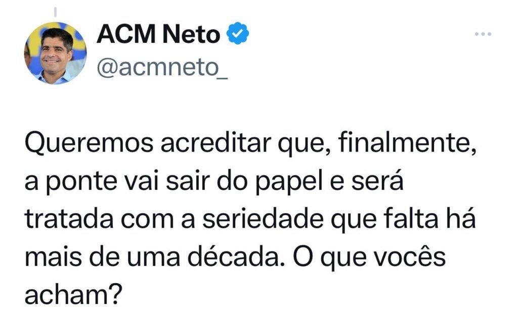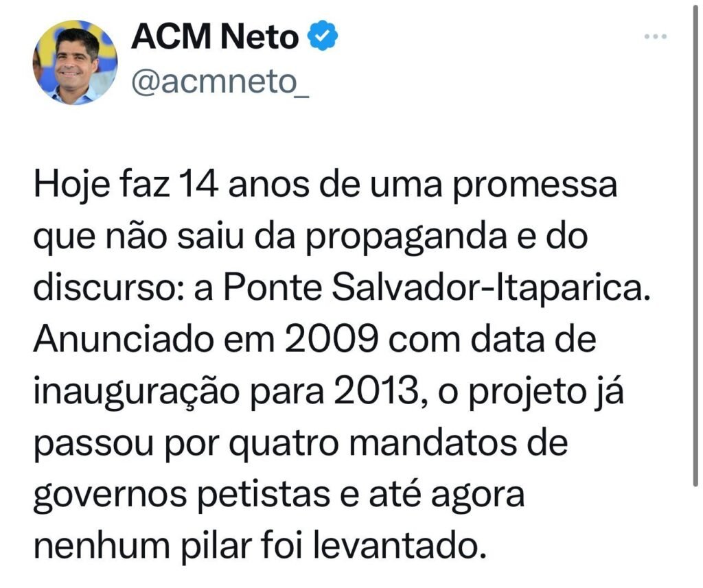 O ex-prefeito de Salvador e secretário-geral do União Brasil, ACM Neto, criticou nesta sexta-feira (24) a falta de transparência sobre a construção da Ponte Salvador-Itaparica. A promessa foi apresentada pelo PT há 14 anos, com data de inauguração prevista para 2013 e cerca de R$ 1,2 bilhão de investimento à época.