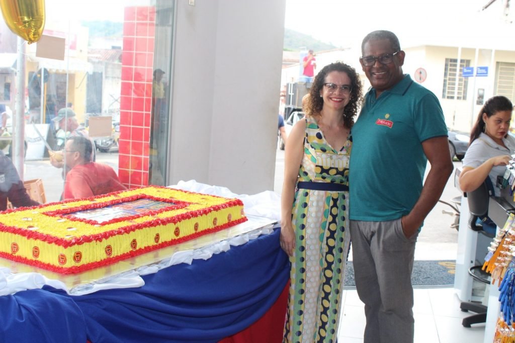 Na festa que teve bolo, sucos, refrigerantes, petiscos, biscoitos, balões, esperando os clientes para a comemoração, estavam presentes os sócios com suas famílias, os gerentes do supermercado e quem não poderia faltar, os clientes, alvo das festividades do estabelecimento.