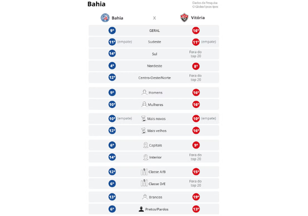 O dado mais expressivo está nas classes D e E: o Bahia ocupa a 6ª colocação no ranking nacional, com 3,6% das respostas, oito vezes mais que o Vitória, que registrou apenas 0,4% e sequer entrou no top-20 deste segmento.