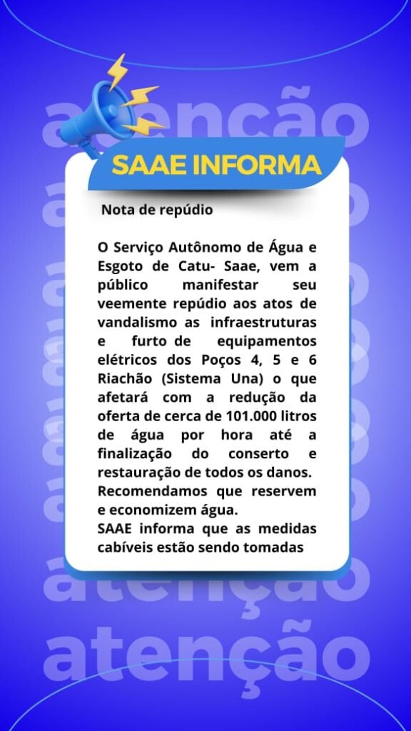 O Serviço Autônomo de Água e Esgoto de Catu (SAAE) vem a público manifestar seu veemente repúdio aos atos de vandalismo as infraestruturas e furto de equipamentos elétricos dos Poços 4, 5 e 6 Riachão (Sistema Una) o que afetará com a redução da oferta de cerca de 101.000 litros de água por hora até a finalização do conserto e restauração de todos os danos.